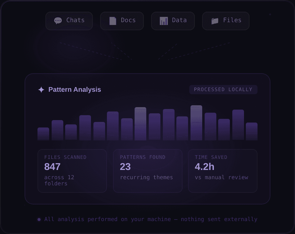 No cloud dependency. No telemetry. No subscription to an AI service. Everything runs on your machine and nowhere else.